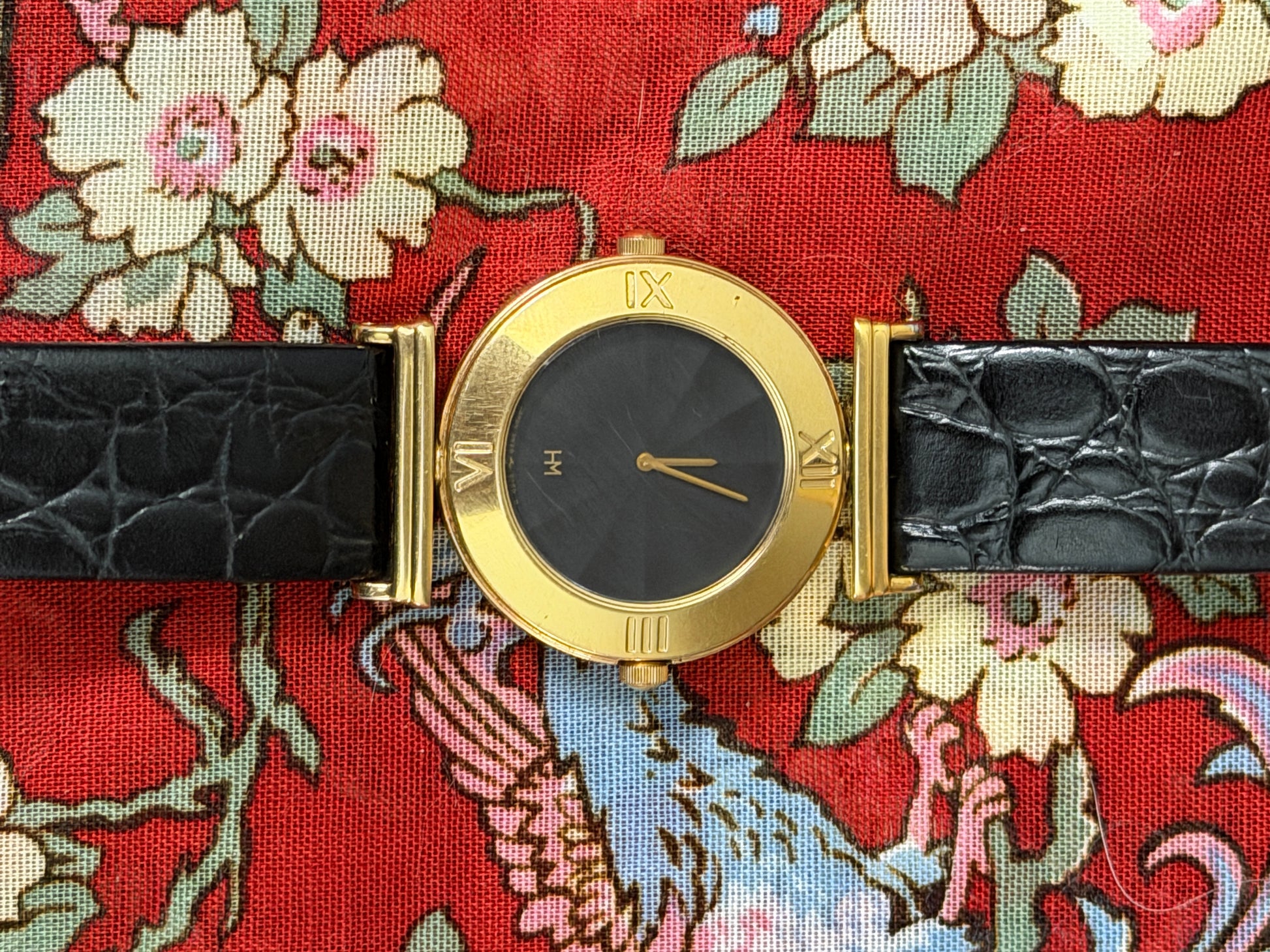 Bezel: Fixed gold-tone bezel with engraved Roman numerals: